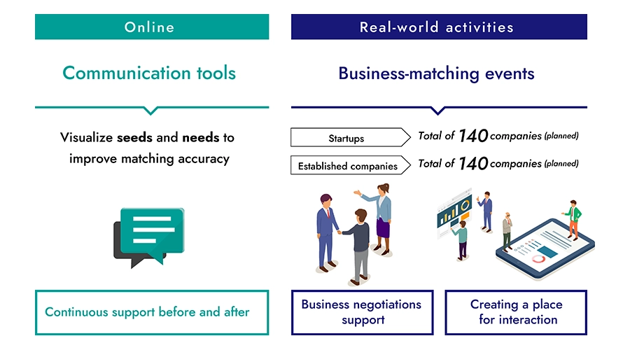 As part of the business-matching program at Japan Mobility Show Bizweek 2024, a new online communication service, Meet-Up Box, is being introduced to promote optimally effective and targeted business discussions between the established companies and startups participating in the business-matching events that will take place during the show. The use of this service will enable business-matching program participants not only to view, prior to the start of the show, information on the companies participating in the program but also to submit offers to listed projects in order to communicate directly with the company/ies with which they wish to be matched. This will provide program participants with the opportunity to better understand each other’s supply-side/demand-side needs and business challenges and also allow them to set up meetings during the show ahead of time.